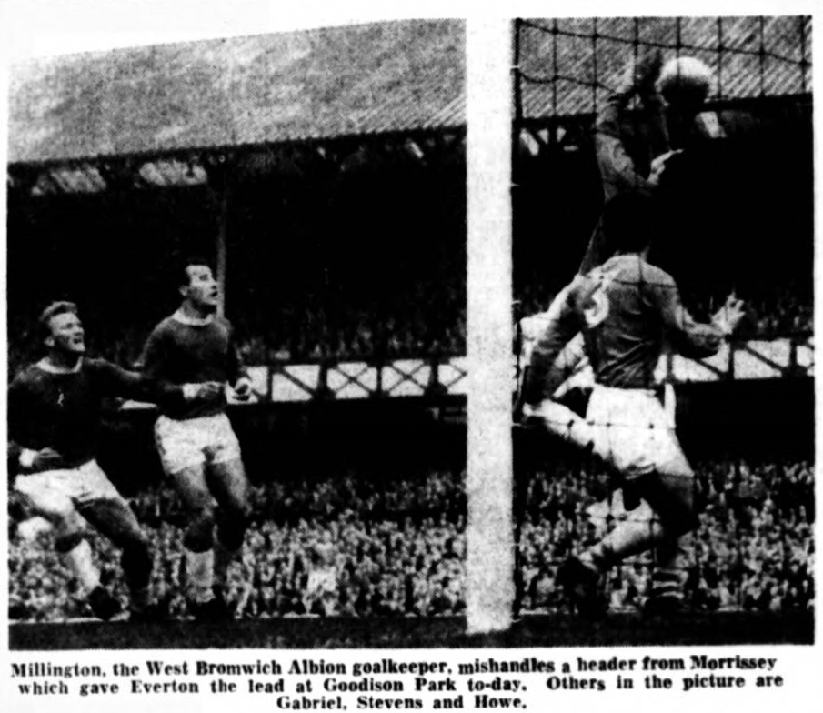 Everton; West; Meagan, Thomson; Gabriel, Labone, Harris; Bingham, Stevens, Young, Vernon, Morrissey. West Bromwich Albion;- Millington; Howe, Williams; Cram, Jones, Drury; Jackson, Foggo, Smith, Kevan, Clark. Referee; Mr. G. McCabe (Sheffield). For the second successive week there was a Scottish selector at Goodison, watching Everton's contingent in view of Scotland's international against Wales in three weeks. A gusty wind which blew up only half-an-hour before the start seemed likely to make things difficult. The crowd was in the region of 40,000. A lovely bit of combination between Morrissey and Young ended with the winger putting his centre on top of the netting.