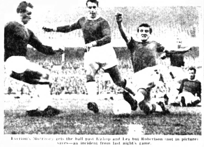 Two Everton players will need fitness tests before the side for the match against West Bromwich Albion, at Goodison Park, on Saturday is announced. Left-winger Morrissey has a pulled thigh muscle; half-back Harris is nursing a twisted ankle. Harris' trouble is responding to treatment, but Morrissey's is making slow progress. Billy Bingham, the club's right winger has been released to play- at outside left- in the Irish team which plays in Poland the week after next.