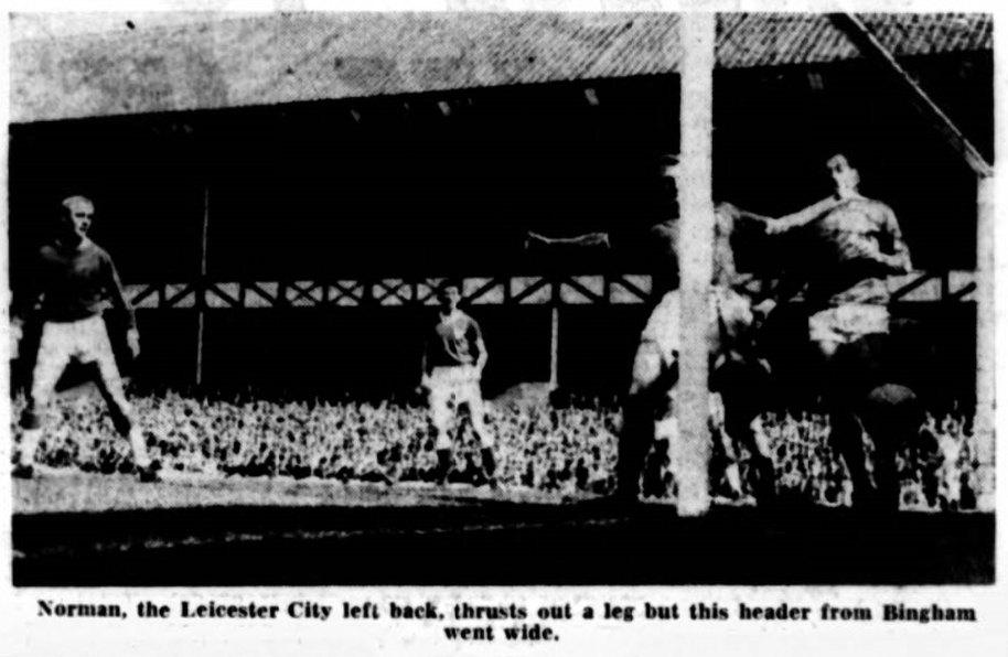 As a spectable the game left little to be desired. It had everything and best of all, that fantastic almost unbelievably good work by Robertson. It may have been possible to fault Mr. Taylor of Wolverhampton, for missing palpable penalties, but he was master of the players and handled them with firmness. Leyton could well have done without the injury to Graham who pitched over West so acrobatically one feared his neck must be broken, he seemed dazed for a long time afterwards. Robertson might well have saved the Bingham shot which scored at the far goal angle, after Young had bedevilled the defence and provided the chance at three minutes. Graham, almost clean through should have got an equaliser, but he pulled his shot. Young after jinking his way to a return pass from Vernon shot against an upright and got the crowd roaring appreciation of his art concealing art. Leyton's big moment was to come and go, without the goal that would have levelled the scores. Deeley's big shot half saved by West travelled on fast and struck Gabriel before bounding over the bar. Lewis all but put through his own goal from a low Bingham centre. Graham enjoyed his second scoring chance and this time hit the side net. There followed a "legging" of Bingham in the penalty box by Lewis, no response from Mr. Taylor. Then a great shot by Morrissey but not one Robertson couldn't get his finger tips to turn for a corner. When Bingham flicked Morrissey's corner kick in on the volley the ball went like a bullet, Robertson edged it for a corner.