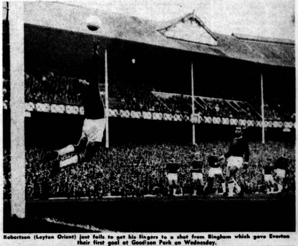 If only London could have seen the Everton which played so brilliantly when beating Leyton Orient by three goals to nil! Where at Fulham they had been slow, temperamental and torpid they were now fast, clean and so clever them Leyton did not lose by double figures. There must have been 10 goals if they had not struck the bar or post three times: had two deserving penalty claims disallowed and found the veteran goalkeeper, Robertson, playing like a man with three pairs of hands. I have seen some great goalkeeping in my time, but this capped the lot, because so many of his miraculous denials of the Everton line came when even the shooter himself could hardly have sensed precisely where the ball would fly! No wonder Robertson got a warming ovation to himself among the tremendous one given to the winning side as a whole and to Young in particular. I never saw, either a man unluckier than Young not to figure among the scorers. Besides hitting a post twice and putting the ball into the net with a rocket shot after the whistle had for a penalty, at least two other great efforts perished at the hands of the goalkeeper. They said Robertson was virtually finished when he became one of Chelsea's pensioners after seasons of great service. He proved himself last night to be better than ever. As great a Scot as any on the Everson books.