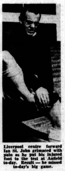 No remarks about this game would be complete without reference to the encouragement given to both sides by their supporters. I don't think it ceased for a moment and on the pitch, confined by the high stands, the noise as deafening. Our Liverpool supporters must hate been in Special training because theirs was the chant which we could hear above anything else, and we all want to thank them for their great encouragement. Ian St John was terribly disappointed to miss the game.