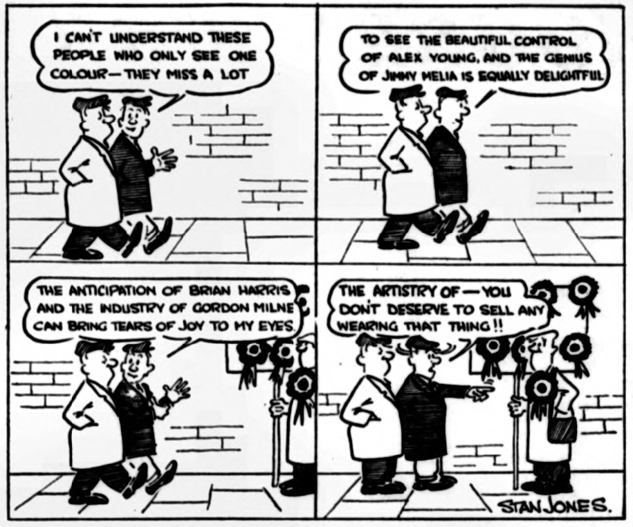 Reverting to that man Darley. Listen to what he's cooked up (but don't take it too seriously) to make Evertonians fond of Anfield and Liverpudlians fond of Goodison Park. " After much diligent research and consideration I have devised a plan, simple and comparatively inexpensive, by which both our senior clubs can, if they wish (and I am sure they do) increase their attendances by about 30,000 for each home game. Impossible? A dream? Not at all. Here's the way; - "Both clubs have, I suppose, a hard core of about the figure quoted, of supporters who would in no circumstances dream of going to the opposition's games. Right. Now all that is needed is a vigorous publicity campaign to sell the attractions of the clubs to rival supporters. "For a start, at Anfield, a board might be carried round in the wake of the sportsmen who advise us of the forthcoming attraction at the Stadium. The notice would perhaps read: ' You like Scottish centre forwards? There's a good one at Goodison, too. At Everton the notice might display: ' After the Everton School of Science, why not try the Anfield Academy of Art. Leaflets could be distributed at Everton matches showing Jim Furnell in action, and saying I keep out everything, except my friends, from Everton—they are always welcome at Anfield. "At Anfield the leaflets would he of Brian Labone, stating—" I bar all centre forwards, but Everton is always wide open to my friends from The Kop." "The next step would be television, of course, and to the persuasive chaps who convince us nightly of the magic powers of ' Splosho.' Sludgo ' and ' Scummo ' (when every husband who's tackled the weekly wash in his wife s absence knows everything comes out a dirty grey, anyway) the conversion of Red to Blue and vice-versa should be mere child's play. "Once the transformation is complete, the situation would have intriguing possibilities. Picture the scene at Anfield after the game, when the announcement is made that Everton have been beaten 4-0. Instead of the customary cheers, the Anfield air would be rent with groans and strong men in red and white scarves would be led sobbing from the ground. "True, there would be some opposition from the ladies, who have hitherto relied on their spouses' support on the home front every other Saturday, but another campaign could be directed at them stressing, perhaps, Alex Young's smashing hair-do, Roger Hunt s profile, or Ron Yeats's physique. "This accomplished, the weekly attendances would be up around the 100,000 mark, and at this stage I pass the ball on to Messrs, Moores and Williams. "If any readers have any ideas of their own to further this great cause, please put them in a sealed envelope, with two aspirins, and send them to Leslie Edwards "