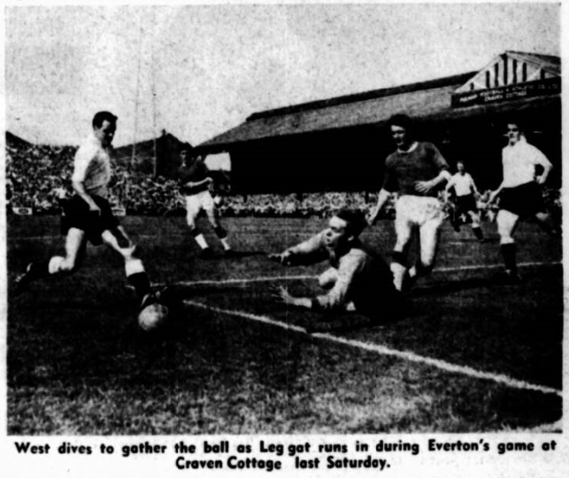 A vast disappointment. That was my reaction (and it must be that of thousands of others) to Everton's 1-0 defeat at Fulham. A first defeat at Spurs or even Arsenal would not have been disgracing, but for the top side in the land to fall to a Fulham minus Haynes and Robson… there was the sting of the failure. As if that were not enough Everton did nothing to odd to their reputation among fans in London: nor, for that matter, did Fulham! They mixed it so successfully the wonder was that none was badly hurt. Gabriel and Cook, duelling almost from the start, were often lectured by referee Tuck of Derbyshire, but never once, as far as I could see, did he book them. If he had we might have been spared some of the "spectacle" which ruined the match. I blame the referee as much as the players. From the two players the canker spread to half-a-dozen others. Finally Thomson, who had had an excellent game and who had kept clear of trouble, unrooted Leggatt at the edge of the penalty box and was fortunate, in the circumstances. I thought, to remain on field. The foul may well have been accidental, but coming late in so contentious a match it looked awful. Referee Tuck then disallowed instantly two Everton penalty claims—one for handling, one when Macedo tugged at Bingham—and Fulham survived Everton's desperate and all too late effort to snatch a point and remain unbeaten. Whether it was the heat or whether they thought their task was just too easy it isn't possible to judge. But the effect was unmistakable. They were not half the team they had been in earlier matches this season. It could be that Fulham brought them down to their own level. To be fair, Fulham fought with better spirit (sometimes too much so), and if they had taken advantage of even half the handling mistakes West made the issue would have been resolved long before the end.