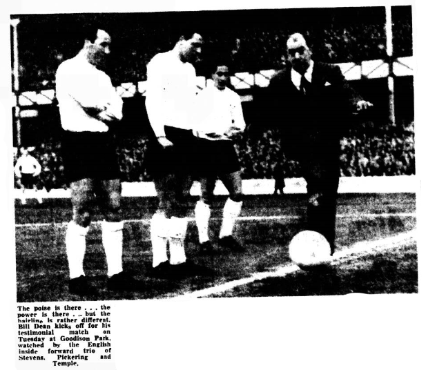 Teams have now been announced for the Bill Dean testimonial match at Goodison Park next Tuesday night, between English and Scottish players from our two senior clubs. “Old man out” is Welshman Roy Vernon –a place has been found for him among the Scots. Liverpool players Hunt, Milne and Thompson are not available. Hunt and Milne have to join the England party before the international at Hampden Park a week tomorrow, and Thompson is in the England Under-23 side against France in Paris next Wednesday. The teams are;- England.- Rankin; Byrne, Moran; Harris, Labone, Kay; Callaghan, Stevens, Pickering, Temple, Morrissey. Scotland.- Lawrence; Brown, Thomson; Gabriel, Yeats, Stevenson; Scott, St. John, Young, Vernon, Wallace.