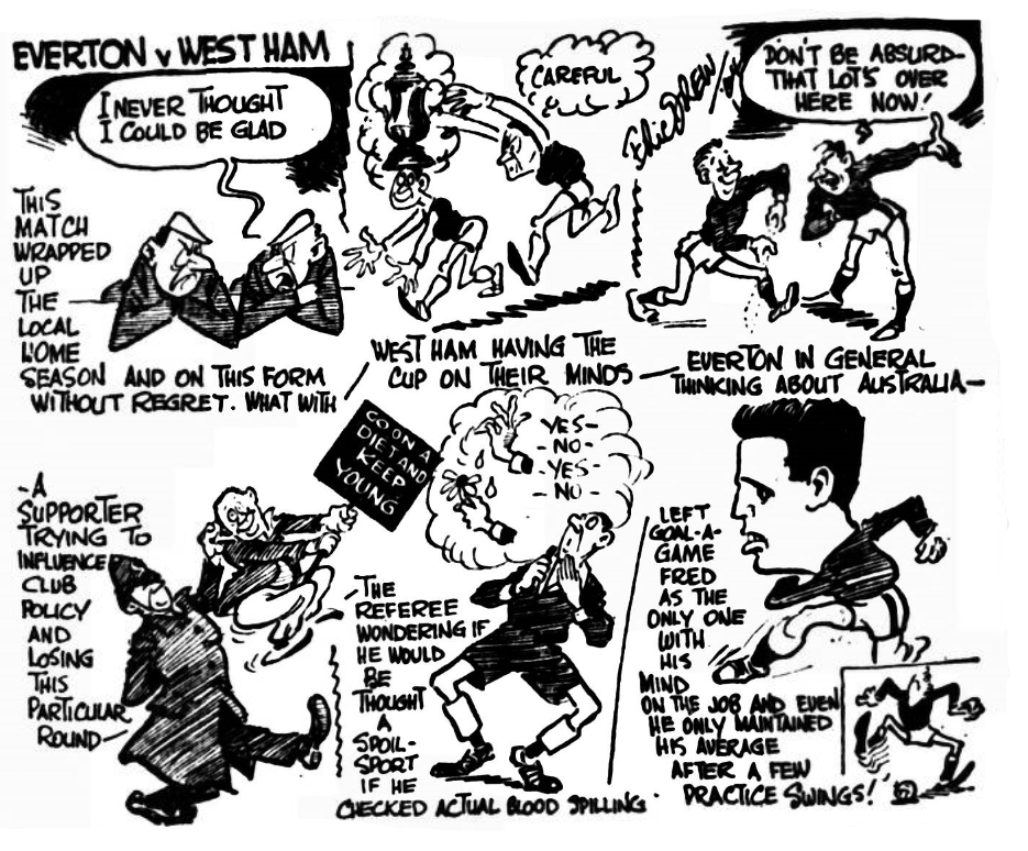 If West Ham play next Saturday the same unenterprising defensive stuff they showed us at Goodison Park the Wembley final is hardly going to be worth watching. Two of their team-Byrne and Moore- were at Preston sizing the form of their opponents, but their absence alone surely should not have made such a difference? If the game the previous week at Anfield was the highlight of the season this match at Goodison Park came perilously close to being the lowlight of all 42 home’ matches played in this city in 1963-64. Everton did their best (which wasn’t very good) to make a match of it; West Ham’s strolling players, continually dropping back into defence and scarcely ever making a worth-while attack, seemed more intent on escaping injury than anything else. It was therefore one the least distinguished matches we’ve endured for a long, long time. Even the pro-Young element, one of whom produced himself and a board reading “Keep Young, sack Catterick!” before a ball was kicked, hardly got the reception he expected. He was last seen being escorted down the subway and presumably out of the ground. He was luckier than us. We had to stay! Manager Catterick was not present to see the last performance of his side prior to their flying off yesterday for their close season tour of Australia. He was occupied elsewhere looking at a player. There are some positions, if Saturday’s game is any criterion, where class players could be used by Everton. Admitting that West Ham crowed their penalty area and made attacking openings scarce. Everton did little enough to suggest that they are one of the top three clubs in England. They looked jaded and tired and one cannot think that travel half-round the world and more football in the close season will do them any good.