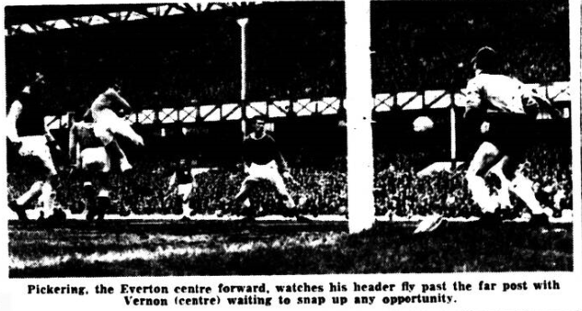 The Everton crowd might have been less critical of their favourites if they had not made such heavy weather of winning by two goals against opposition whose feet may have been at Goodison park, but whose minds were clearly 200 miles (and seven days) away at Wembley. They would have been less critical, too, if two members of the Everton attack had not chosen this occasion to miss chances such as the varies novice might convert. Pickering’s, from four or five yards out, after being provided with the chance by Temple, was a hair-tearing one, but it was capped after the interval by Stevens, who stood not more than three yards from an empty goal- Pickering having drawn Standen from his line- and struck the bar with his shot when guiding the ball over the line seemed a formality. The anti-Stevens brigade seized on this miss as heaven-sent ammunition, I fear they do not balance debit with credit when they asses a player who was completing his second season without missing a match, and whose midfield “graft” always means a great deal to his side. Pickering retrieved himself with two fine goals (one off a shot which Standen did remarkably well to touch, much less save) and thus completed his first nine games for his new club with as many goals. If he can maintain this average, Everton problem of finding someone to crack the ball into the net off well-contrived attacks is solved. The curse is that the rest of the line, as a line, are hardly playing as well as they did before Pickering’s arrival here. Temple still does many things brilliantly and Vernon is the generating point at which much begins, but Scott is having a lean time, and Stevens, whose legs won’t carry him over ground as quickly as they used to, is not quite as sharp as he used to be.