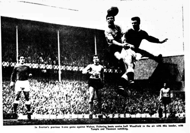 Not everybody in the side defended with the skill and determination of Kay and almost exclusively he was responsible for the forward prompting from the rear. At every stage it seemed that if any one man could galvanise Everton into life, it would be Kay. In the event, it was too much, even for Kay. If Pickering had a chance before West Brom, I think it probably disintegrated in this encounter. Only Vernon appeared to realise that Pickering packs a scoring punch for he seemed most concerned to give the leader his head. Unfortunately opportunities for Pickering were few and far between, and when he was presented with the ideal chance, a few yards out of goal, he mis-kicked in an effort to hook the ball home. This was almost a replica of his falling in the opening minutes of his debut game at Goodison Park, so that it would appear that Pickering has not yet fully mastered the art of the hook. Young hit the crossbar with a header in the closing minutes. It was his only effort of any note, for his contributions to this contest were limited in the extreme. Temple, similarly was not overburdened with opportunity, but he showed a far greater willingness to rove in he did not always fire it with the deadliness now expected of him.