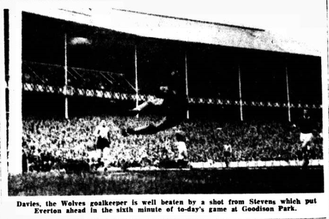 Blackpool Res;- Taylor; Prentice, Thompson; Marsland, James, Durie, Hill, Parry, Andrews, Fisher, Cooper,. Referee; Mr. a Johnson (Birmingham). Everton were first to attack, Shaw put a strong shot, which Taylor saved. Everton were having slightly the better of the game. An Everton free kick had to be taken three times. On the second occasion the ball went into the net. This seemed to upset both teams, and Parnell and outside left Cooper were having a few words on occasions. Everton nearly took the lead when a centre from Shaw went to Harvey, but Taylor made a lovely save. Everton gradually got on top. Taylor saved one point-blank drive from Harvey and pushed a Humphreys effort over the bar. Shaw was full enthusiasm but found that Thompson and Durie were not easily outwitted. Half-time; Everton Reserves nil, Blackpool Reserves nil.