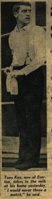 Tony Kay, the Everton F.C player, did not attend a fact-finding inquiry by the Football Association in Sheffield to-day into alleged fixing of matches. Instead he remained in Liverpool, and at the North John Street offices of his solicitor Mr. Harry Livermore met representatives of the Press to reiterate that he had never jeopardised his career as a professional footballer by accepting any bribe for fixing the result of a game. At the outset of to-day’s meeting Mr. Livermore stated that as Kay could not have legal representation at the Sheffield inquiry he had instructed him not to attend.