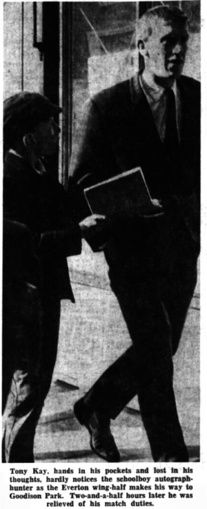 “If the Football Association refused to allow Kay legal representation I would not be prepared to advise him to attend on his own and if any decision was then arrived at by the Association which jeopardised Kay’s professional career the question of challenging that decision of the Association would have to be considered, and the challenge made in the courts. Tony Kay, who has been relieved of match duties by Everton since the allegations were made by a Sunday newspaper, said. “All I want to do is to get back to playing for Everton again, or playing football again.” When asked if he had not committed any infringement by playing in an amateur football match at Huyton, yesterday. Kay replied; “It was not a league game but a friendly match, and I don’t think there is anything in any rules to prevent me playing in a friendly.