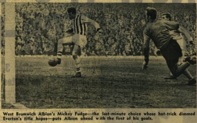 Everton’s championship chances took a nasty tumble at the Hawthorns yesterday. Their failure enable Liverpool to retain the lead in the First Division title race by a point with two games still in hand. Although this reverse is a set back it is not the end of the road yet for Everton. The superstitiously minded will not have lost night of the fact that this was Everton’s first League defeat of the year and it came in the thirteenth match. Superstition, however, made no contribution to the reverse, for Everton were clearly second best. The match was a triumph for Mick Fudge the eighteen-year-old inside-forward West Brom had to introduce at the last minute because of an injury to Kaye. Not easily will he forget Easter’s of this year. On Monday he played with West Brom Reserves and yesterday came the opportunity to snatch glory with a hat-trick which completely sank Everton. It was his first senior game this year and only his tenth in all.