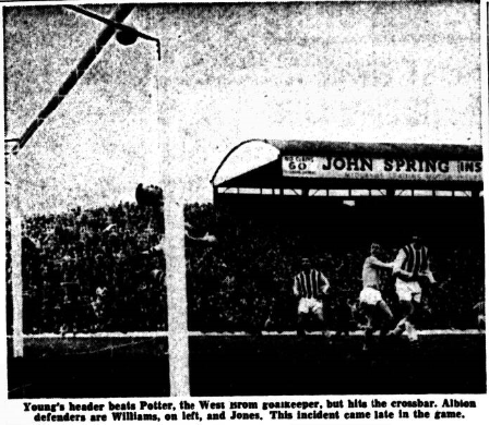 One wondered why Everton took so long to infuse the fighting fury they reserved for the closing stages when their position was already impossible. True they snatched a goal back and Young headed against the bar, but it was a dying expression of desperation with little or no chance of succeeding. Everton failed to open out the game in a way which might have served them to better purpose. Young seldom entered into the picture and a much more progressive Temple had to seek out much of his own opportunity. Patently Everton were relying on the big guns of their firing line, Pickering and Vernon to do the damage. Hard though they tried and twice though Vernon scored, the Albion half-backs were too strong to give rise to real hopes of a major break-through. Kay, back after his attack of tonsillitis, always seemed to be the one man who could fire Everton into the necessary life to overcome West Brom’s solid defence.