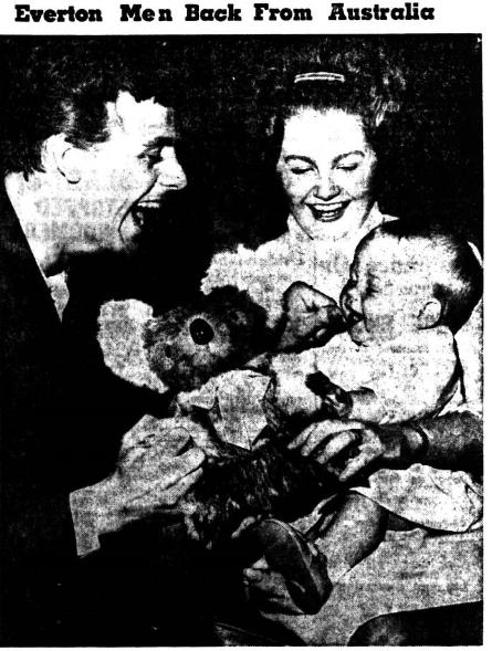 Skipper Roy Vernon could not praise highly enough the reception and hospitality the team had received. He felt the tour had been a great fillip to them all and he was happy that Everton had provided some great displays of football. "I think we left the Australians with a better appreciation of what our football is like here at home," he said. A mix-tip over baggage caused a flurry at the almost. Mr. Micklesfield put down his three overnight bags in the buffet, and a few minutes later they had disappeared. A frantic search of the airport with the help of police failed to find them—but when Mr. Micklesfield reached home the mystery was solved. George Heslop lending a hand with the bags put the bags in Gordon West's car and the mix-up was soon sorted out. The players had koala bears among their souvenirs, and the picture shows Gordon West with his wife Ann and baby son Stephen, who has taken to the bear immediately.