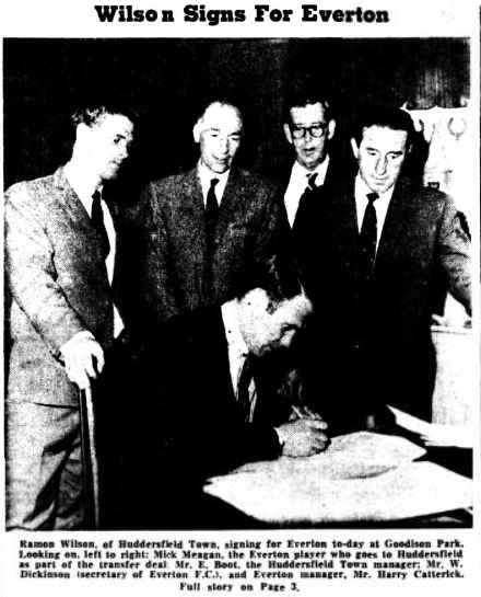 Ramon Wilson, England and Huddersfield Town full back, to-day became an Everton player. As part of the deal, estimated to cost Everton £40,000. Everton's Eire international, full back, Mick Meagan, who, has been with the club for the whole of his professional career, goes to Huddersfield. Manager Eddie Boot and Wilson arrived at the Everton ground at 11.30 this morning. Meagan had flown from Dublin at the request of Everton manager, Harry Catterick. Forms were signed by 12.30. The only stumbling block had been the possibility that Huddersfield would not be able to offer Meagan the terms he required. Mr. Catterick said: "I have been in touch for some weeks with Huddersfield over the transfer. Twice before Meagan has come over from Dublin for conferences with Huddersfield; twice he went back home because terms offered did not meet his requirements. HOLIDAYS HELD UP
