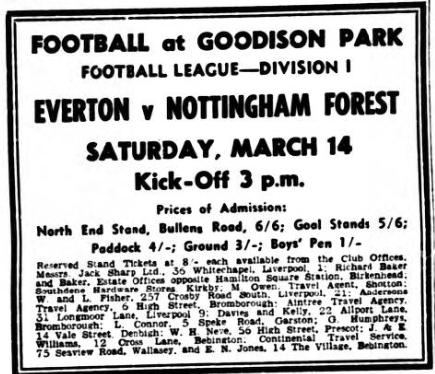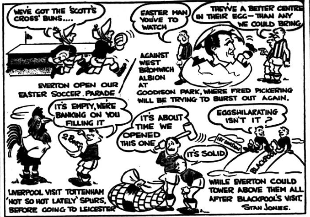 They are saying that this may prove “the championship of the sold shirt.” The inference is that Everton, having brought Pickering from their Blackburn rivals, have brought success. There was no necessity for Blackburn to sell if they didn’t want to; there was necessity for them to transfer the player to Everton if they didn’t want to. It might well be that the championship will be recalled as the one of the sold shirt- but the question I would ask those who make this assertion is “Are you sure he colour of the shirt was blue-and-white and not red? Blackpool, who come to Goodison Park to-day, will remember their last visit. They were beaten 5-0. They also lost to Everton at Bloomfield Road and when the teams met at Blackpool last November Everton got a point from a 1-1 draw. Oddly Pickering was fated to play against Blackpool over Easter whether he left Ewood Park or not. Blackpool have home and away fixtures with his old club during the holidays. It is difficult, even at this stage, to realise that Blackburn and Matthews are not synonymous. They said that when Stanley went Blackpool could never be Blackpool again, but the wise management of Ronnie Suart and careful husbandry –Blackpool gates would scarcely support Tranmere Rovers much less Everton or Liverpool –they are still battling in Division 1 and from reports I have heard of them in the past few weeks are doing better now than at any other stage in the season.