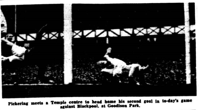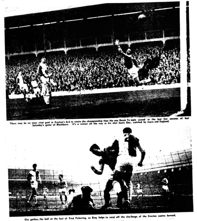 Blackpool might well have gone further behind with Young stabbing the ball on to the bar from a Morrissey pass and Morrissey's flying header stopped literally on the line but somehow they survived and when Horne scored in the second-half they were shaping as though they might get another and so wreck completely Everton hopes of finishing ahead of their neighbours. It was then Young, getting up very high, nodded the neatest of goals from Morrissey's centre and clinched the thing. Blackpool's goal had come, fittingly, from a free-kick ruse following a foul which prevented what might easily have been a scoring move. Green, the onetime Tranmere player tapped the ball a foot or two to one side and Horne had it in the net before the massed Everton defence could do anything. If there is a more tantalisingly ineffective team than Blackpool in the First Division 1 have yet to see it. They have talent; youth and fine defenders in Waiters and Armfield, but their two paces forward, three paces backwards "progression" got them nowhere fast! In the skeleton on gilts, Rowe at right half-back, they have a great player in prospect. Maybe if Armfield had not been limping most of the second-half the defence would have been less panicked by the Everton forwards. Waiters tipped over the bar Pickering's best drive and the one he must have thought would bring him a hat-trick. If Young was less in the picture after the interval he certainly produced the decisive goal at the decisive moment. Everton's strength was in their fine half-back line in which Gabriel, as captain, plays an ever-increasing part. With Temple switched to the right to accommodate Morrissey the wing situation was far better. There was striking ability on both flanks. Manager Catterick's problem for to-morrow is now not who to put in but whom to leave out. He's welcome to that headache. It is one few of us would want to share with him.