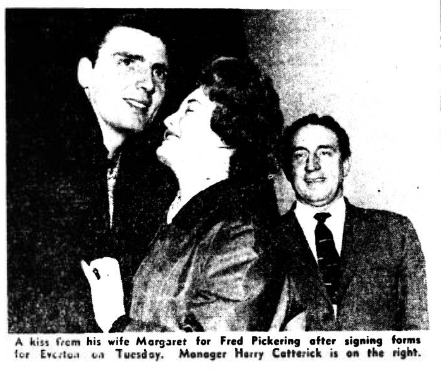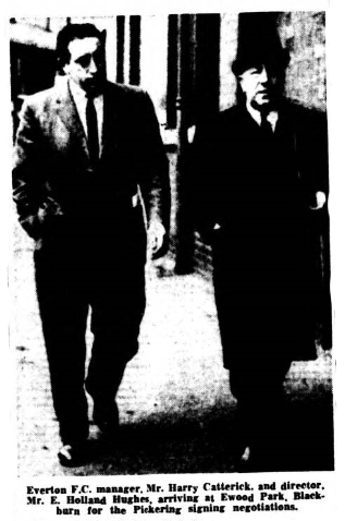 Everton manager Mr. Harry Catterick has seen Pickering play several times this season, the last occasion being on Saturday when Blackburn beat Bolton wanderers 5-30. In the Everton-Blackburn which at Goodison park earlier this season. Pickering had a particularly good game. He has scored 30 league and Cup goals this season and is almost certain to lead the England attack against Scotland next month. The player has said that he wants to better himself financially and Blackburn whose gates are poor compared with their good league record this season clearly cannot afford to compete in wages with clubs whose players are on basic wages of between £50 and £80 plus bonuses.