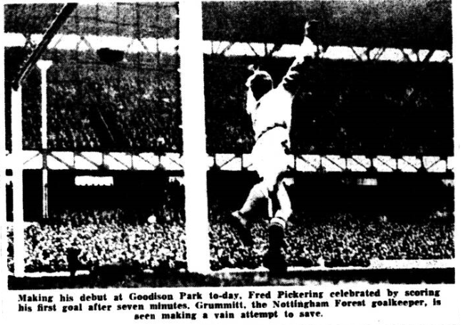 Two men and two moments made the match at Goodison park memorable. The men- Fred Pickering, Everton’s newly acquired goal striker, and the man he deposed. Scottish international and the player of the classical touch, Alex Young, who returned at inside left. The moment …in the sixth minute when Pickering headed himself unconscious in scoring Everton’s first goal and the other four minutes from the end when Young rising majestically centre, to Morrissey’s beautiful centre, outjumped Waiters to nod the last goal.