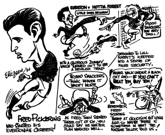 Pickering is a Blackburn man. He joined the staff at Ewood Park when he was 17 and was captain of the Youth team which won the F.A. Youth Cup competition in 1958. Originally, he was tried at left back but did not make good there. When he was switched to centre forward a position he has held with the Blackburn and Lancashire boys’ team he settled down slowly but in the past two seasons he has developed quickly into a great player- well-built powerful with a good shot, and good heading ability. It is believed that he is anxious to come to Mersey side where he would be following the lead of Roy Vernon a star forward at Blackburn who came to Goodison Park in a deal which involved the present Swansea centre forward then at Everton Eddie Thomas. If Pickering moves the fee might well be a record for a forward transferred between British Clubs. West Ham paid Crystal place £58,000 for John Byrne in March 1962.