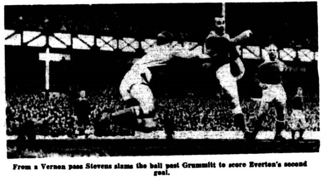 Three minutes after the Interval Foggo fired into the Everton net again. Fortunately for Everton, the referee had already indicated an indirect free kick for obstruction on the winger by Meagan.