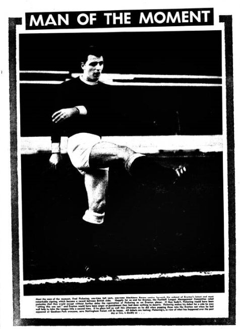 Blackburn Rovers received, this morning the request for transfer from their England centre-forward, Pickering, but whether he will be permitted to leave Ewood for Goodison or any other park this side of the end of June is open to grave doubt. When the Blackburn board meet to-night to discuss Pickering’s application (and interviews he gave over the week-end) they will almost certainly rule that they expect him to honour his contract –as they are prepared to honour theirs- until June. Then, they will almost certainly advise him to reapply for a move and the matter will be considered afresh. Besides their contract argument, Blackburn are likely to say that they could not think, at the moment, of letting the player go. They feel they have as good as chance as anyone of winning the League championship and consider that if they let a star player go attendances would drop alarmingly and the morale of the rest of the team would be impaired. Thus is seems certain that Pickering’s request will result in impasse. Everton have said nothing of their interest in the player, be he did have an outstanding good match against them at Goodison Park this season and it is clear, from Manager Harry Catterick’s trip to Blackburn on Saturday, that he was taking a long, considered look at a man whose go-ahead style would suit Everton central need. Whether the wordly possessions of an Everton player who talked with Pickering when the England players met last week has had any bearing on Pickering’s dissatisfaction with Blackburn’s terms is anyone’s guess. I do know that fellow Blackburn players are using all their influence with Pickering to persuade him to stay. Pickering’s request and the repercussions it may bring in train could produce quite a serial story within the next few weeks. Whatever happens I don’t see him being allowed to leave Ewood until June at the earliest.