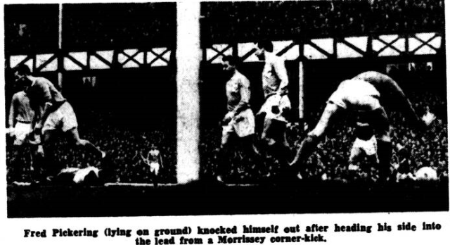 There was more action; more Everton expertise in the first 15 minutes of this match than there had been in the 90 against Albion. Pickering, having suffered complete eclipse by Jones, now not only got two goals, but both with his head—and what goals! The first came at six minutes with almost explosive speed. It reminded me very much of the famous goal by Stubbins, at Anfield,when Liddell's free kick seemed to be swerving wide and Stubbins's head-long dive at the ball produced the finest non-shot goal ever seen at Anfield. Oddly, Stubbins, too, was not a centre noted for his forehead ability. In Pickering's case, Morrissey, who first game after a spell in the reserves is invariably a stormed, provided the fast-moving centre after beating a tackle and keeping his feet when stumbling. Pickering threw himself at the ball and clearly must have made contact with the crown of his head. The tremendous roar as the ball rocketed against the back of the net he cannot have heard—he was unconscious. Team-mates ran to him to acclaim a spectacular goal, but Pickering did not hear or see them, either. He was out for the count, and a good two minutes passed before Gordon Watson (deputising for injured trainer Tom Eggleston) could bring him round The possibility of Pickering scoring early and being so concussed he could take no further part in the match must have been uppermost in many minds; it was certainly in mine. Fortunately, all was well. Thirteen minutes later, in yet another enthralling bit of play, he had scored again, and this time even more worthily, more dramatically. Pickering took it with a right-foot shot which left back Martin took on the head unflinchingly as hestood on the goalline near the post: the ball rebounded, was flicked into the centre, and Pickering, with lightning reflexes, glanced it over the line off as good a header as Dean was ever capable of making in similar circumstances.