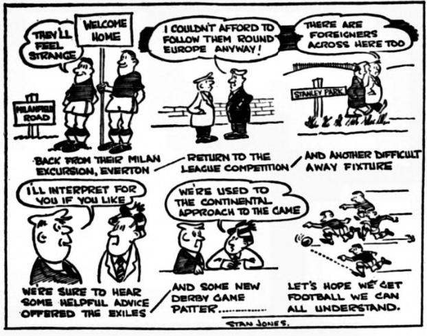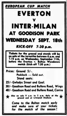 While in Milan a hotel at Monza about eight miles away was chosen for the Everton headquarters before the second leg. Prices for the first let at Goodison park will be increased and these with methods of application for tickets will be announced soon. But before they tackle Inter-Milan, Everton have to rub out the memory of Saturday’s thrashing at Old Trafford and they are at Bolton to-morrow night. In the Bolton team outside right Lee is dropped and injuries bring in Deakin (inside right) and Lennard (left half) for Russell and Stanley. Birch replaces Lee on the right wing.