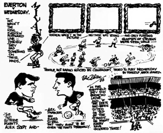 Everton have had to reshuffle their forces made than somewhat. Young’s cut thigh means that Temple, who cracked some good goals when the first got into the senior side, comes back hearer to his original inside forward position. Brian Harris will welcome the move back to his wing half-back berth leaving the way clear for the new signing Brown to get back to duty after being ineligible for the match in Milan.
