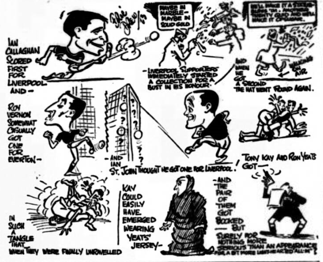At the end when 31,000 saw the players shake each other by the hand is gesture that was no formality) the curtain went down on a “Derby” which will be remembered as Callaghan’s because he got both his side’s goals and the first was from a shot as hard as any Liddell ever delivered. Callaghan had drifted into centre-field to allow Melia travelling the other way to take the ball from his feet. Melia then found Callaghan at inside-left with a pass which left the recipient all the time he needed to tee up his shot. One could sense him gathering all the force at his command as he bit that shot from every inch of 25 yards. The ball flew like a bullet to West’s left and found the net just under the angle bar and post. If he plays at Anfield for 30 seasons Callaghan will surely never hit one with such power and such lethal direction. His second was more worthy in the making than the taking St. John, with an overhead flick to Melia on the left wing started it all. Melia with Harris to beat gave that half-back the dummy and then pointed the ball back quietly but most effectively for Callaghan to hit it through the ruck West might overwise have covered it with his left foot. Thus West and Everton felt the weight of both Callaghan’s feet. He had scored with his right now he did it again but with his left. Only when Vernon jabbed the ball home after Temple had flicked Parker’s centre from the right into the yard area were Liverpool jolted out of confidence been of their long lead. It was well for them that Lawrence remained faultless though he did not in the later stages have to make any big “saves.”