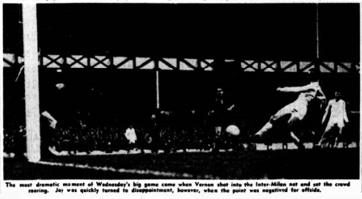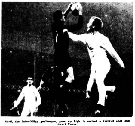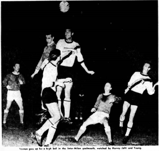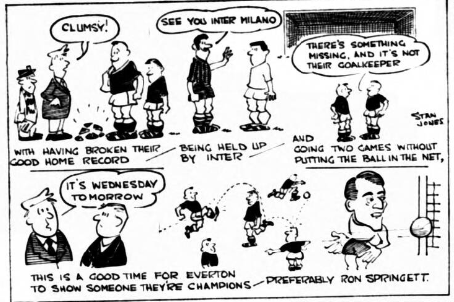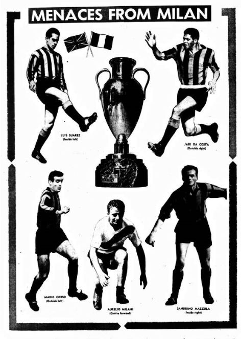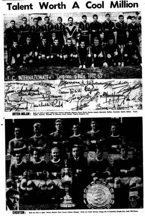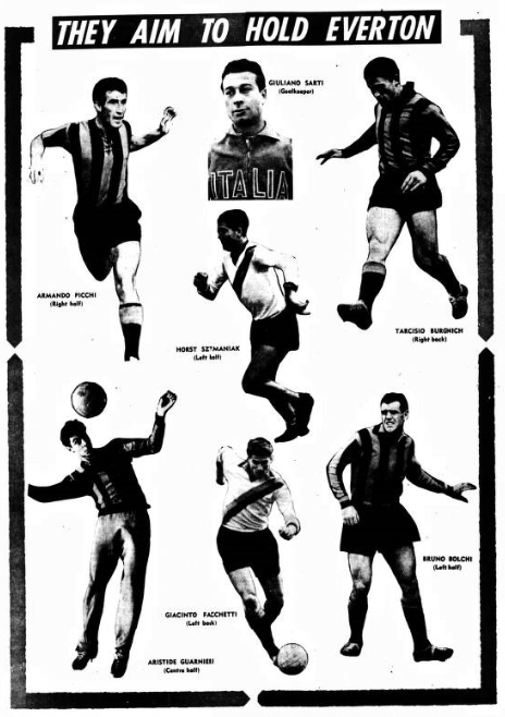 Everton chairman John Moores manager Harry Catterick and trainer Tommy Eggleston saw Inter-Milan beaten 2-0 by Milan yesterday. Mr. Moores said afterwards; “I expected to see Inter-Milan play much better. They did not impress me a great deal. Their ideas were strictly defensive and they did very little attacking. “Their great Spanish inside forwards, Suarez had a very poor game.” He added; “I really cannot say whether Inter-Milan are more in form than Everton. After all, we lost heavily at Manchester. The best men in the Inter-Milan line-up for Mr. Moores were left back Facchetti, centre half Guarnier, centre forward Milan and German left winger Szymarilak. He said “Szymaniak played more as a wing half aiding the forward line. But he is very strong, and has good constructive play. The centre forward is also a man of great strength.”