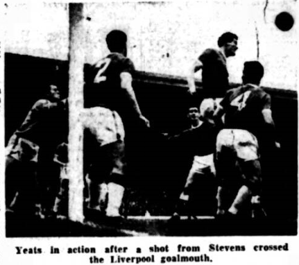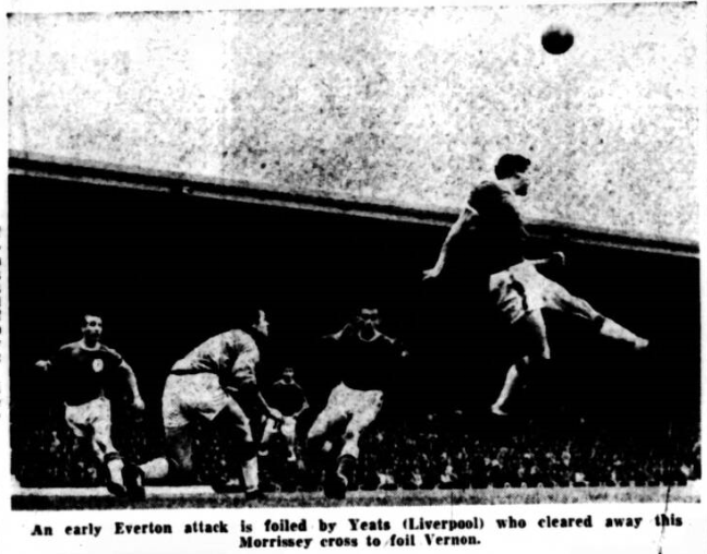 Stevens was playing very deep for Everton, almost as an additional wing half and Stevenson was also dropping back for Liverpool. Scott’s speed was an constant danger to Liverpool and he sped past Ferns in great style before hitting a powerful cross which hit the upright and went behind. Yeats made a splendid tackle when brown raced through to temple who just failed to get in his shot before the Liverpool captain saved a dangerous situation. The first real escape of the match came for Everton. From a free kick by Byrne Kay headed the ball down but straight to Melia, who was closing in and made his shot only for West to save the day by getting his body in the way. The referee had a word with Byrne after a particularly vicious tackle had floored Scott. The referee used the advantage rule for Morrissey after the Everton winger had been fouled by Byrne allowing Morrissey to recover and go on before hitting a shot over the top. There was some pretty rugged tackling from both sides, and the intensive of the marking and general defensive cover was so great that few attacks were being developed at all.