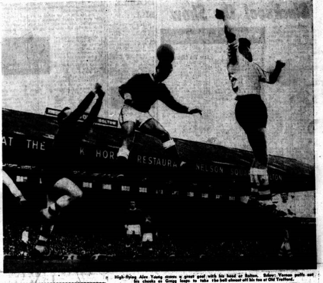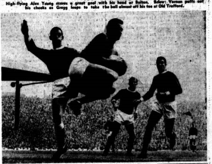 As the heights of the humiliation at Old Trafford on Saturday, Everton salvaged what honour was left to them by a sporting acceptance of Manchester United’s superiority and with a stunning 5-1 reverse recorded against them, applauded their conquerors off the field, after the ground had resounded to the cheers of the United followers, for whom the match could only have brought back memories of their team’s greatest days. They wiped clean the slate from the Charity Shield disaster of a fortnight ago, with goals and more goals, and a tit-for-tat exploration of the Continental inter-passing with which Everton had riled them at Goodison Park. Stunned Everton may have been by the sensational turn of events, but Alex Young, I thought, struck the right note when he said. “I don’t see any reason why this should throw us out of our stride. There was nothing wrong that we cannot put right, I didn’t think we played too badly. It was just that they played better.” There is a lot of truth in what Alex says but he is undoubtedly kind to the defensive shortcomings, particularly at wing half and left back. Meagan could not have done more. He was simply outpaced by young Moir who could give him yards start and a beating at will.
