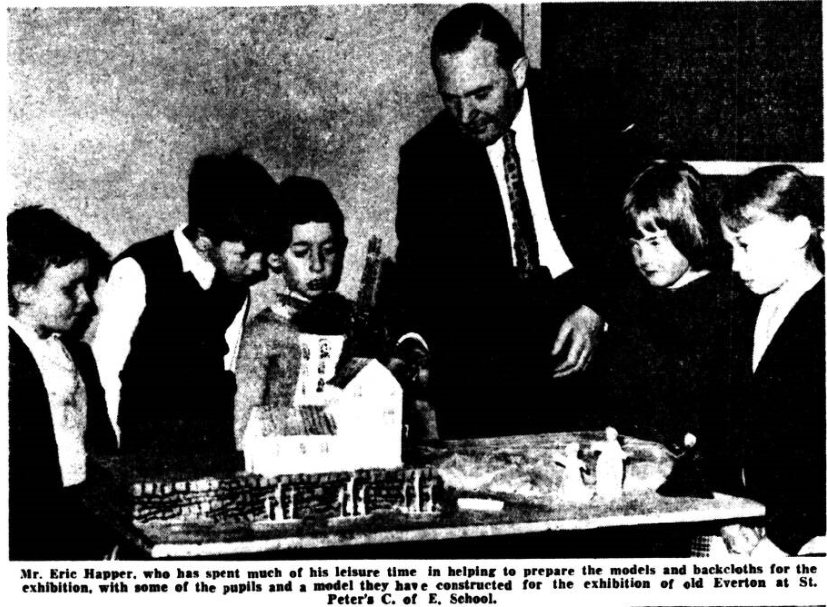 Seven hundred years of Everton history depicted in an exhibition of models, books, pictures, paintings and maps went on view in a city school to-day. The result of three years of research by staff and pupil, of the 107-years-old St. Peter's C. of E. School, Sackville Street, the exhibition is probably one of the most detailed compilations of the area's history ever made. Led by their headmaster Mr. Edward Newton, a keen local historian, five teachers and 160 pupils of the tiny school which stands in the shadow of the mighty Everton Heights have produced a colourful history of the area since the days of Henry III. It was Mr. Edwards who carried out most of the research, spending over two years digging for information about early “Eofor Tun" in the City Archives, and record offices of Liverpool and Preston. ILLUSTRATED FOLDER