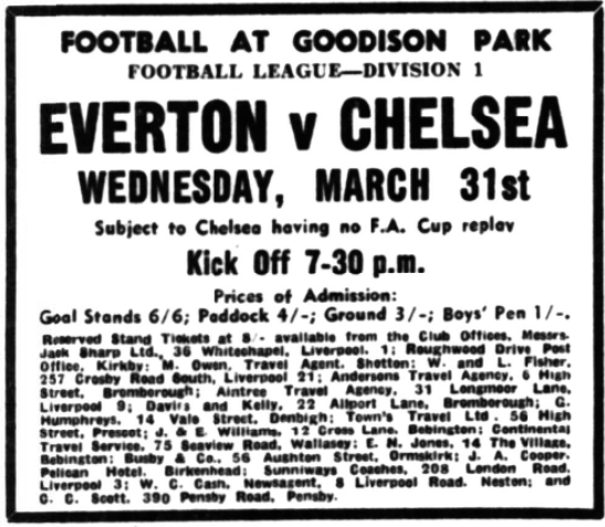 The long delayed, eagerly awaited returned league match between Liverpool and Everton, at Goodison Park, will take place on the evening of Monday, April 12. Everton who play Chelsea at Goodison Park tomorrow night, have one salient change. They bring in at left half back, for the first time in his career at Goodison Park, Sandy Brown, a full back who likes the offensive role and is an excellent shot. Brown often played in Scotland in this position prior to coming to Merseyside. Chelsea, whose bid for the double was ended by Liverpool return to the League championship chase with the side that was beaten in the F.A Cup semi-final. Everton.- West; Wright, Wilson; Gabriel. Labone, Brown, Scott, Harvey, Pickering, Temple, Morrissey. Chelsea; Bonetti, Hinton, McGreadie; Hollins, Mortimore, Harris, Murray, Graham, Bridge’s. Venables, Tambling.