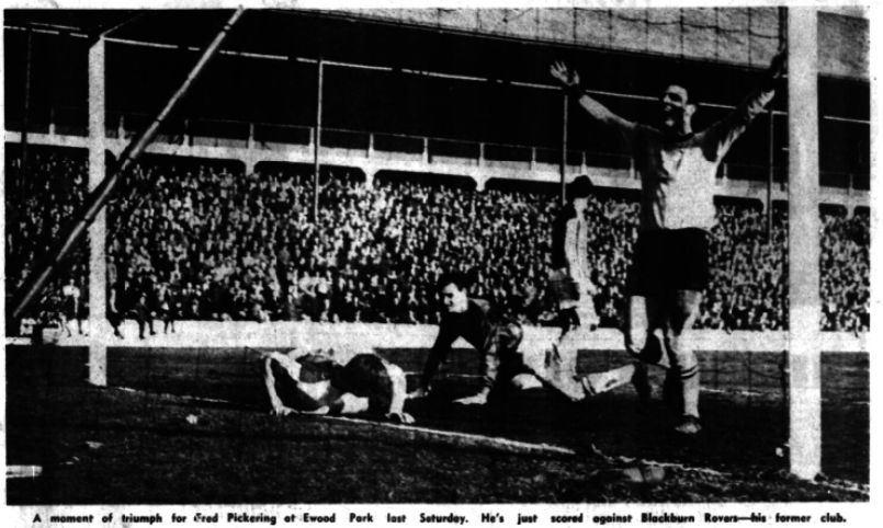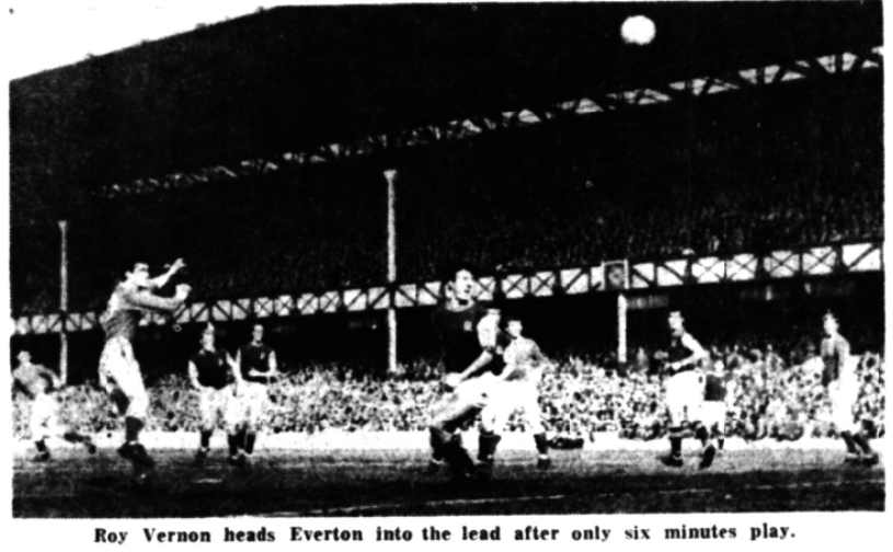 Everton led in 20 minutes when Harris and Pickering linked up near the left touchline and when the centre forward chipped the ball forward Harris was there to beat Jones, after McGrath had failed to cut it off. Pickering’s goal in 21 minutes was amazing. Scott left the Blackburn defence standing and his cross seemed to be too far behind Pickering, who somehow got a back flick with his right foot and put it into the net. Blackburn Rovers; Jones; Bray, Joyce; Clayton, England, McGrath; Ferguson, McEvoy, Bysom, Douglas, Harrison. Everton; West; Wright, Wilson; Gabriel, Labone, Harris; Scott, Harvey, Pickering, Vernon, Temple. Referee; Mr. E. Crawford, (Doncaster) Attendance 15,960.