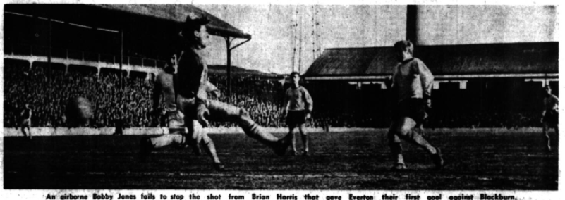 Late in the second half there were one or two contentious incidents, particularly one between Wright and Ferguson, and the Blackburn outside right got further severe caution from the referee when he kicked the ball away after a free kick had been awarded against his team. Everton's first goal was scored in 20 minutes when Brian Harris and Pickering combined so that when the centre forward pushed the ball through, Harris was on hand to slam it into the net when McGrath missed it. The second goal, eight minutes later, was a fine effort, because when Scott centred it would seem that the ball would pass behind Picketing. However, the centre forward managed to flick his foot back and hook it into the net. Once Everton had established this lead there was never any danger, and had the forwards shot more often they must have rubbed it in.