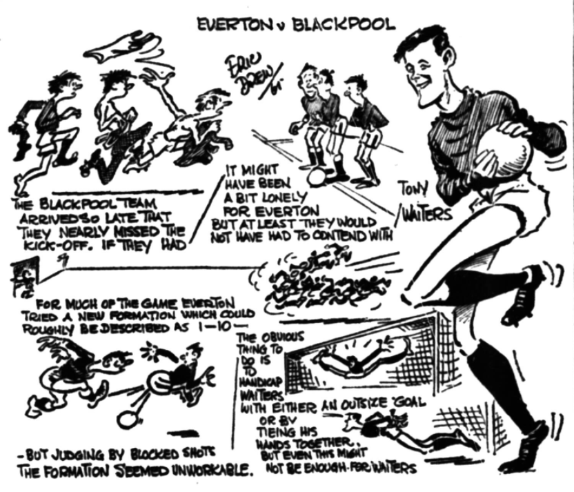 But we had more than that from one raucous individual who could hardly be missed and it seems to me a pity that some action cannot be taken to make a spectator, or spectators, appreciate that the right of criticism does not include a form of abuse which can be offensive to others within hearing. I can understand the frustration which brought it and the slow handclap, but I doubt if the frustration of the supporters equalled the frustration of the Everton players, as they saw a game they should have won comfortably escape them. Where I disagree is that it showed a lack of acknowledgement of the brave fight Blackpool produced and I found the match infinitely more entertaining and enjoyable than that at Sheffield the week before when Everton did win. Sure Everton should have won! They had chances galore, but Blackpool’s defence also battled magnificently and what is more important they had the little bit of luck which helped them to take a point. I think this was completely emphasised early in the first half when Vernon suffered his first frustration. Fine goalkeeper though he is, I doubt if Waiters knew anything at all about the flick which hit his outstretched arm and came out instead of going in.