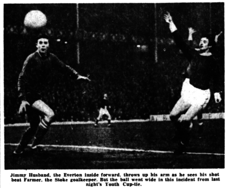 Everton’s youth team made sure that the club’s supporters will have something to cheer in the next few weeks by qualifying for the semi-final of the F.A Youth Cup at Goodison Park last night. Although they preserved their record of not conceding a goal in the competition they were only able to score once themselves and were always struggling. Stoke’s youngsters seemed to follow in the footsteps of their seniors and for much of the game concentrated almost exclusively on defence. This was a pity, for in centre forward Woodward and right winger Worsdale they had players fully capable of extending the strongest opposition. For once Evertonians nippy little left winger Maher met his match in Stoke’s full back Marshal and it was significant that with him almost completely subdued the Everton attack lost much of its usual sting. Though inside left Husband made several scintillating runs and might have scored on two or three occasions the attack rarely developed its full potential. Indeed right half Hurst, a real bulldozer of a player, often looked more dangerous than any of his forwards and his power shooting forced Farmer to a number of brilliant saves. Although there were many near misses the only goal of the match came from centre forward McLaughlin in 23 minutes. Left back Darcy floated a free kick into the penalty area. Husband nodded the ball on and McLaughlin popped the ball into the net from close range. Attendance 13,630.