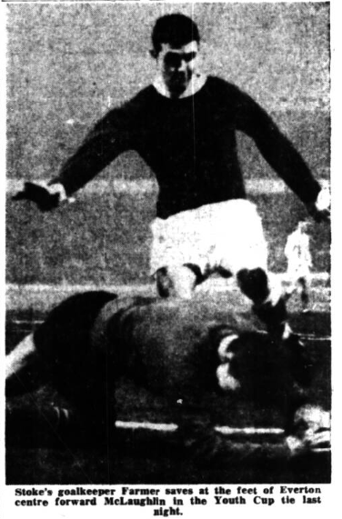 A goal by centre-forward McLoughlin, after 23 minuteswas sufficient to give Everton victory over Stoke (F.A. Youth Cup quarter-final, at Goodison Park) lastnight, but the home side had their toughest fight of the seams against a close marking, strong tackling Potteries' team. A solid Stoke defence, in which inside left Starkey dropped back to play along- side centre half Keeling, had most of the answers to Everton’s usual long passing game with full backs Bentley and Marsh keeping a close watch on the speedy Goodison wingmen, Wallace and Maher. Stoke’s mistake was that they appeared to be content to stay on defence even after Everton had scored, hoping that a quick break would produce a goal and earn a replay. They failed in this because the build-up of their attacks was too slow, although there were a number of occasions when centre forward Woodward, who made his First Division debut last week-end against Chelsea, bustled his way through and put across fast centres which Barnett, in the Everton goal, could only push away.