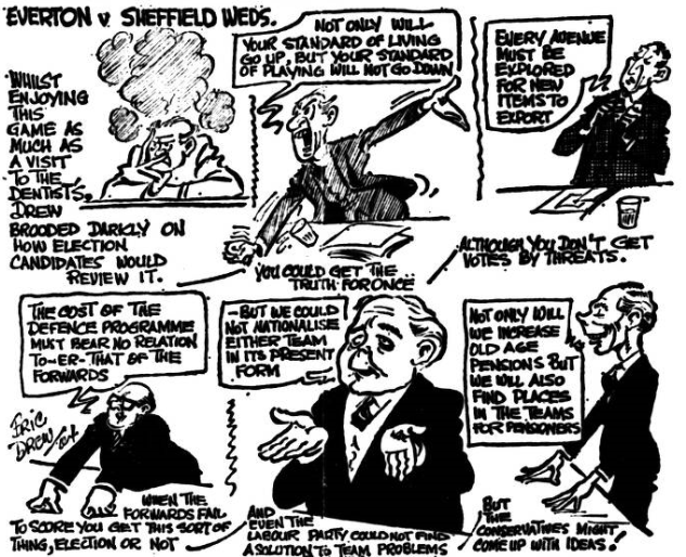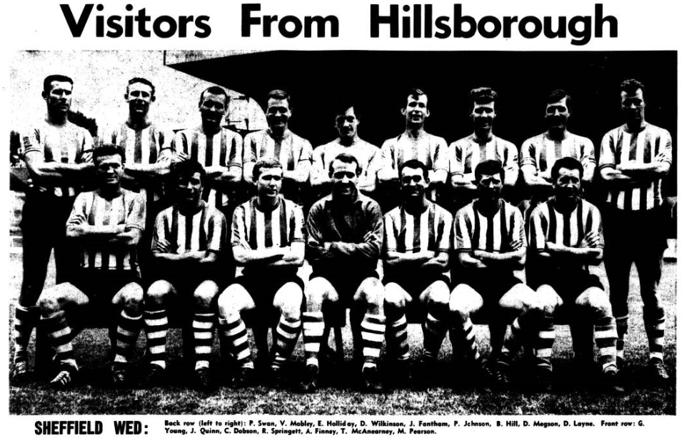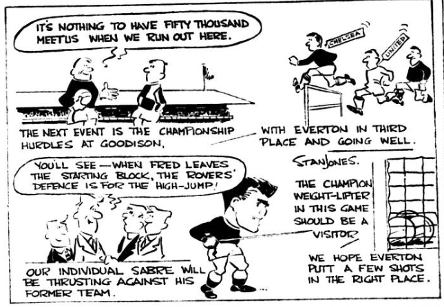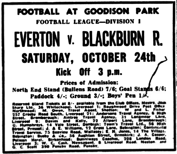 Gabriel opened with such a show of dedication to duty in his shadowing of arch menace. McEvoy that memories of his move sketchy display began to fade. He certainly prevented two goals by head and foot but his grip on McEvoy was not maintained, although it was Labone’s slip which gave McEvoy a presentation goal in 21 minutes after the centre half had come precariously close to conceding an own goal. Gabriel was roundly beaten as McEvoy flicked home the equaliser in 52 minutes. In the light of events the criticism, I have sometimes made of Stevens that even as a forward he played like a half back seemed to be confirmed, for no one else in the forward linen remotely approaches the cover Stevens used to give. The absence of this comforting additional aid, plus of course the fact that Wilson and Brown were missing, left the defence leaky and suspect. For Bradshaw to be able to head the winner from Ferguson’s in-swinging corner kick (69 minute) was a direct indictment of Everton’s lack of awareness of danger. Bradshaw had far more ground to cover to reach the ball than three defenders but it was the Blackburn man who got there. When so many of his colleagues found it so difficult to appreciate that England’s stranglehold on Pickering, after that early slip was such that, it was an increasing embarrassment to ply, him with possession, Harris was sufficiently enterprising to attack the target from a different angle. For a team aiming high like Everton to be conceded a two-goal start and then be beaten, at Goodison Park too, is hardly the reaction calculated to disperse the gathering gloom clouds over Merseyside. Admittedly Blackburn are a decidedly useful side, more useful probably than their record suggests (especially that mid-week reverse against Workington Town). It will probably console Goodison supporters not at all to realise that their team’s fate was very similar to that experienced by Liverpool at Blackburn earlier in the season, when similarly, a two goals Rovers’ deficit was converted into a 3-2 triumph. Even Liverpool’s defeat at West Brom did little to case this latest Goodison let0down, Everton and Liverpool have not scored a single victory in the last three weeks. Everton; Rankin; Parker, Harris; Gabriel, Labone, Stevens; Shaw, Young, Pickering, Harvey, Temple. Blackburn; Else; Newton, Joyce; Clayton, England, McGrath; Ferguson, McEvoy, Byrom, Douglas, Bradshaw. Referee; Mr. S. Howley (Birmingham). Attendance 40,943.