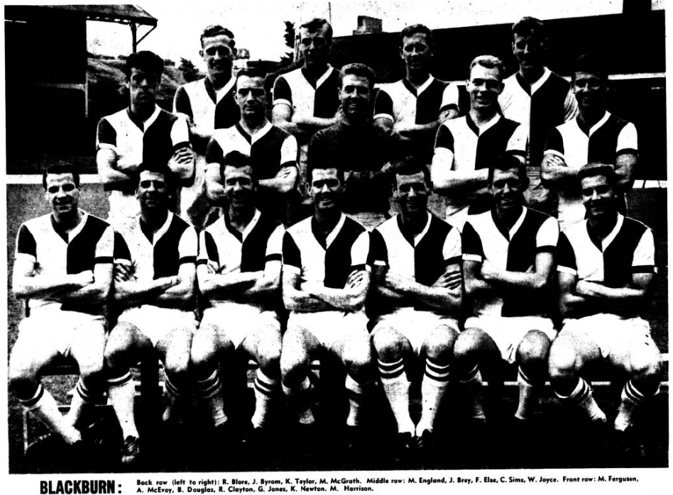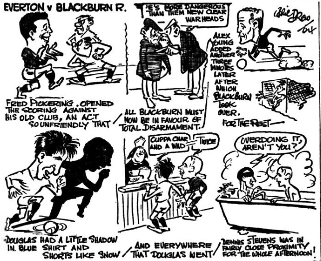 Everton had some good chances, despite England's command of Pickering in the air and his speed in moving to the ball round the Everton centre-forward when passes came through, earth-bound. But Else saved brilliantly from both Parker and Harris and also from Temple when it came, in the final twenty minutes, to a siege of Blackburn goal few can have anticipated that Everton would succeed in breaking through against a big relentless defence whose covering of each other left few loop-holes. Douglas did his stint with the casualness of the artist who can impose his will on the game and on opponents where and whenever necessary. He did as much as was needed, no more. Stevens made a good try to quall him, but in the end was on the wrong end of a number of free-kicks-all deserved. I thought Referee Howley handled strongly and well what could have been a difficult match. If Stevens came off second best, mostly, against Douglas he went up in a number of estimations by being one of the few players ever to stop playing when an opponent had been accidentally kicked on the face! The Everton attack, denuded as it is, of two of its most experienced players, rarely moves nowadays as a line. Harvey could do no right; Shaw, promising though he is, is not ready yet, physically or in experience for the hurly-burly of first-class professional football. Blackburn wore down opponents leading 2-0 with a relentless performance in which they pinned everything on good football and more good football, they may not be a great side, but they are a good one and they thoroughly deserved to win.