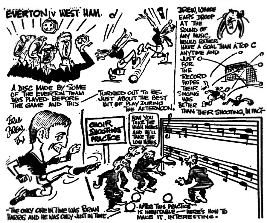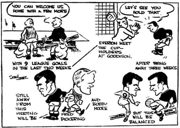 Which is more important to a side- the king of stoppers or the king of scorers? Some light may be shred on that query at Goodison Park to-day, where Everton, without Fred Pickering, receive West Ham United without Bobby Moore. Before we shrug off the question it may be interesting to reflect for a moment on the fact that Pickering claim ten of Everton’s twenty-three goals. For all the scoring bursts which produced four goals and five goals in successive games Pickering apart not one of the Everton forwards has registered more than twice and “Sandy Brown is still second highest scorer with three. At least with Scott’s double at Birmingham, every Everton forward is now a scorer. This is the first time since he joined them from Blackburn last March that Everton have been compelled to find a substitute for Pickering. Mr. Catterick has solved his problem by moving Gabriel to lead the attack bringing in a now fit Parker at right back with Harris going to wing half.