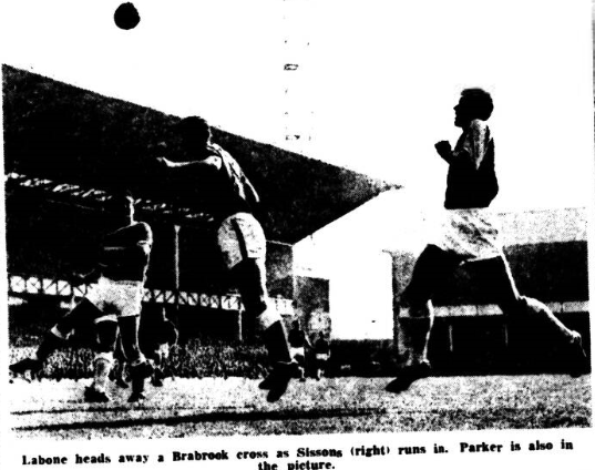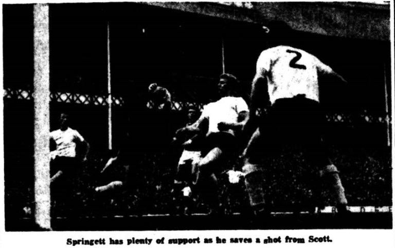 If we must bail England for defensive excellence which probably stamps him as the most successful centre half in the country, and there is no doubt he was worthy of all the superlatives, let us not forget the giant in Everton’s ranks- Dennis Stevens. In turn his conversion to half back has meant the demotion of Gabriel and Harris. Those entertaining doubts of the wisdom of this preference must have had them swept aside with gale force as Stevens tackled the menace of Douglas with supreme confidence and practical skill. A lesser player than Douglas would have been hounded into impotency by Stevens’ slavish devotion to a cause but spared the necessity for his normal defensive contribution by a bolstering to handle the Everton attack, Douglas persisted and persisted.