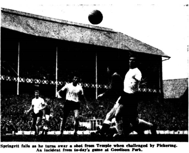 Although disappointingly Derek Temple’s name had to be added to Everton’s list of casualties yesterday, as the result of a pulled thigh muscle received in the Inter-League game in Ireland on Wednesday. Everton’s tale of woe has a brighter side. manager Harry Catterick was able to announce last night that Roy Vernon and Sandy Brown have made such good progress in the last week that both may be available for the visit to Arsenal to-morrow. Like Temple, Alex Scott, victim of a representative match injury is labelled “Extremely doubtful.” The outlook is as favourable for Vernon and Brown as it is depressing for the two wingers. Vernon was injured in the home game with Sheffield United on September 12 and has since missed eight League matches. That spell was broken with what was really a fitness test in the second leg of the Inter Cities Fairs Cup game with Valerengen, but the injury reasserted itself early in the match. During the Welshman’s absence Everton have dropped seven points.