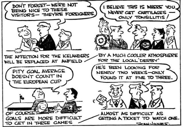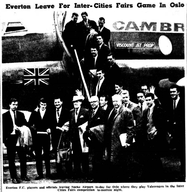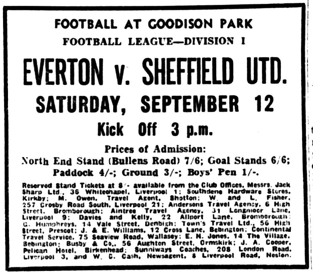 For the Inter Cities Fairs Cup tie, Everton v. Valerengen I.F. (Oslo) on Wednesday,' October 14 (7.30 p.m.). stand tickets will be available as follows: Centre Stand A and B, Bullens Road, Goodison Road Blocks D and F, and Lower Stand (centre) Bullens Road, first six rows, 10s: rear of stand, 9s. Lower Stand, Bullens Road (sides) and Blocks A, B, C and G,H,K Goodison Road, first six rows, 9s; rear of stand, 8s. All