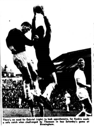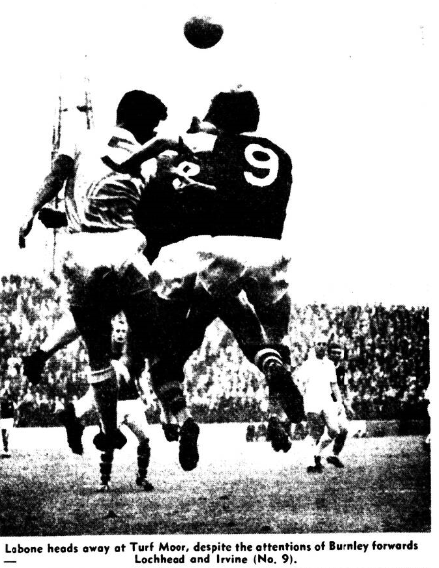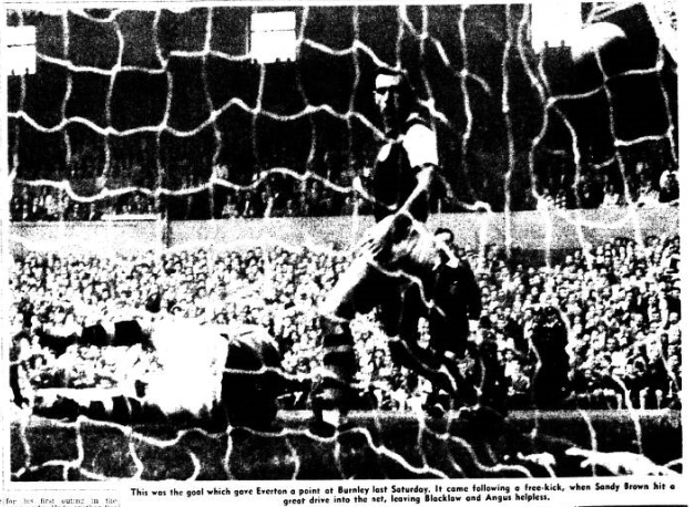 Andy Rankin, in making one of the most courageous dives of the afternoon at the feet of Towers, was badly scarred about the neck. It speaks much for his toughness and willingness to get on with the game, that he made light of his disability when others were going down for trivialities. Neither Parker nor Brown effectively mastered Morgan or Towers, but the great thing about an out-of-sorts Everton was the wonderful determination. They never looked like giving up, even when Burnley threatened to get right on top. Labone I thought, a splendid game and as a result of cuts on each side of the head finished with his head and chest covered with blood. Apparently appearances were more serious looking than the facts for I am assured Labone is ready for action again.