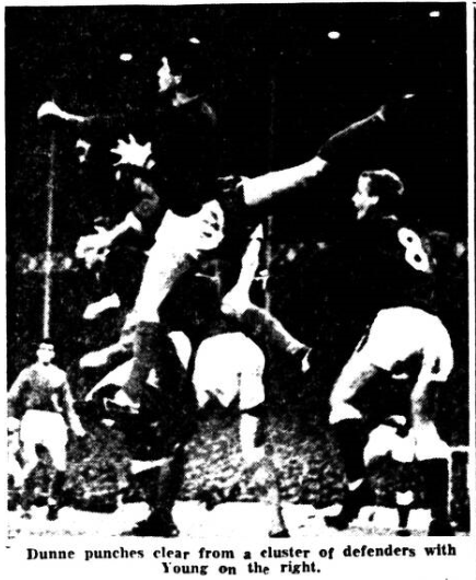 The scoring of the goals helps to illustrate the sort of game this was. First, Burnley went ahead through an O’Neill penalty, awarded when the referee decided that Harris had handled a Tower’s shot as it came down from the cross bar (30 minutes). I found it difficult from the stand to decide who had made the award justifiable. Apparently, the players on the field were equally puzzled. Harris told me; “I think he must have given it against me. The ball struck me on the side of the head and shoulder, and it then rolled down my body. I never handled, and I looked round to see who had offended. “There was nothing to be gained by handling, I could hardly believe it.” Everton’s retaliation (46 minutes) came when Harris tapped a free kick to one side and Brown hit a terrific shot into the net. Rankin, who took an outsize headache home with him as the result of collecting Towers’ boot on the side of the neck, when making the most courageous of saves, was again flawless.