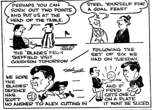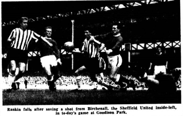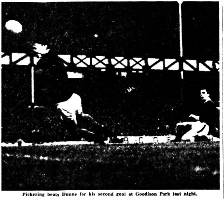 Both teams were playing some fast stuff and Everton had an escape when Stevens misplaced a pass so that Auld was able to take over and run in, but the winger, after beating Harris, only half hit his shot and Rankin had a much more comfortable task than had seemed likely. Auld’s speed and swerve again had Everton in trouble but once more Rankin was called on to save what proved to be only a poor shot. Scholfield was much more burdened to save a header from Harvey when Morrissey flung across a fine centre, and straight away Pickering beat three men without being able to make the vital shooting opening. For several minutes Everton could make little headway but then Scott suddenly appeared on the scene with a fine run and the movement did not end until Schofield and Martin knocked each other out in going for Morrissey’s eventual centre.