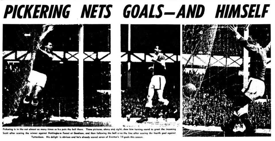 Rankin saved from close range from Wignall, followed by Crowe hitting a fierce shot just wide-it was all Forest. It was fortunate for Everton that Rankin was in superb form, but he had no chance when Wignall put Forest further ahead after 29 minutes with another fine headed goal. Rankin made a brilliant save from Addison’s shot, touching the ball over the bar and from the corner Wignall went up higher than anyone else to head the ball into the net. Immediately afterwards Wignall should have scored when Labone slipped and then Rankin dived full length to save from Newton. Forest’s wingers were so devastating that they turned the Everton defence time and again and the only consolation for Everton was that they were being outplayed at this point by a team playing top class football in all departments. After 38 minutes Everton got a goal back with a surprise effort from full back Brown. Crowe had possession in his own half when brown robbed him and raced through before the Forest defence realised what was happening. He took the ball into the penalty area, cleverly evaded a tackle by Wilson and prodded the ball just inside the post. After this goal Pickering went to the dressing rooms and considering his injury and the manner in which Forest had played, Everton had done reasonably well to hold the score to 2-1.