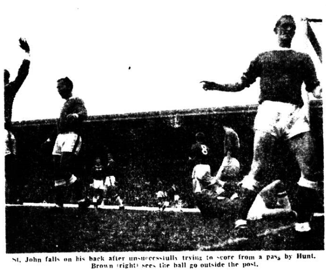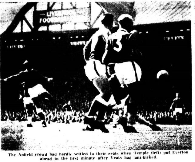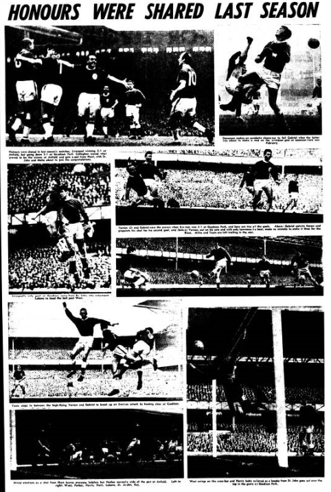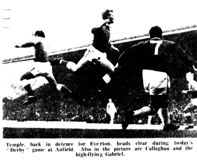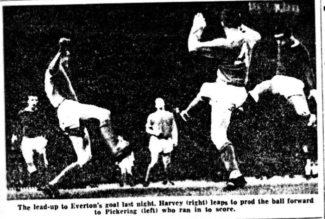 We started favourtes because of Everton's enforced changes, but the favorites were fairly and squarely beaten, so we must give full credit to Everton and congratulate them on their performance. We try to derive some comfort from what might have happened if Roger Hunt's header had gone in and not the bar and if a shot had not been kicked of the line, but these things are part of football. Various account have been written about Everton's first goal, none of which are entirely accurate. With the ball out on the left wing, I was moving backwards covering Fred Pickering in anticipation of the cross, with the result that when it came I was off-balance. I was therefore unable to bring the ball under control so that Derek Temple was able to take the fullest advantage of the situation… and how well he took it.